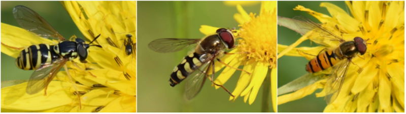 gyakori öveslégy (Chrysotoxum cautum), Kecskés Ferenc, Magyar Környezeti Nevelési Egyesület, teljes méretű kép, CC-BY-SA-4.0 / májusi rétizengőlégy (Epistrophe euchroma), Fráter Szabolcs, https://www.izeltlabuak.hu/talalat/30205, CC BY 4.0 / ékfoltos zengőlégy (Episyrphus balteatus), Kecskés Ferenc, Magyar Környezeti Nevelési Egyesület, teljes méretű kép, CC-BY-SA-4.0